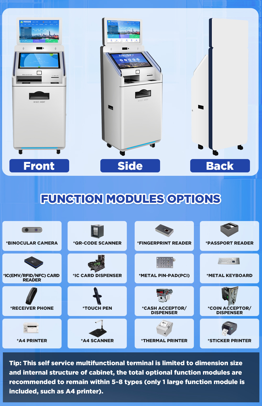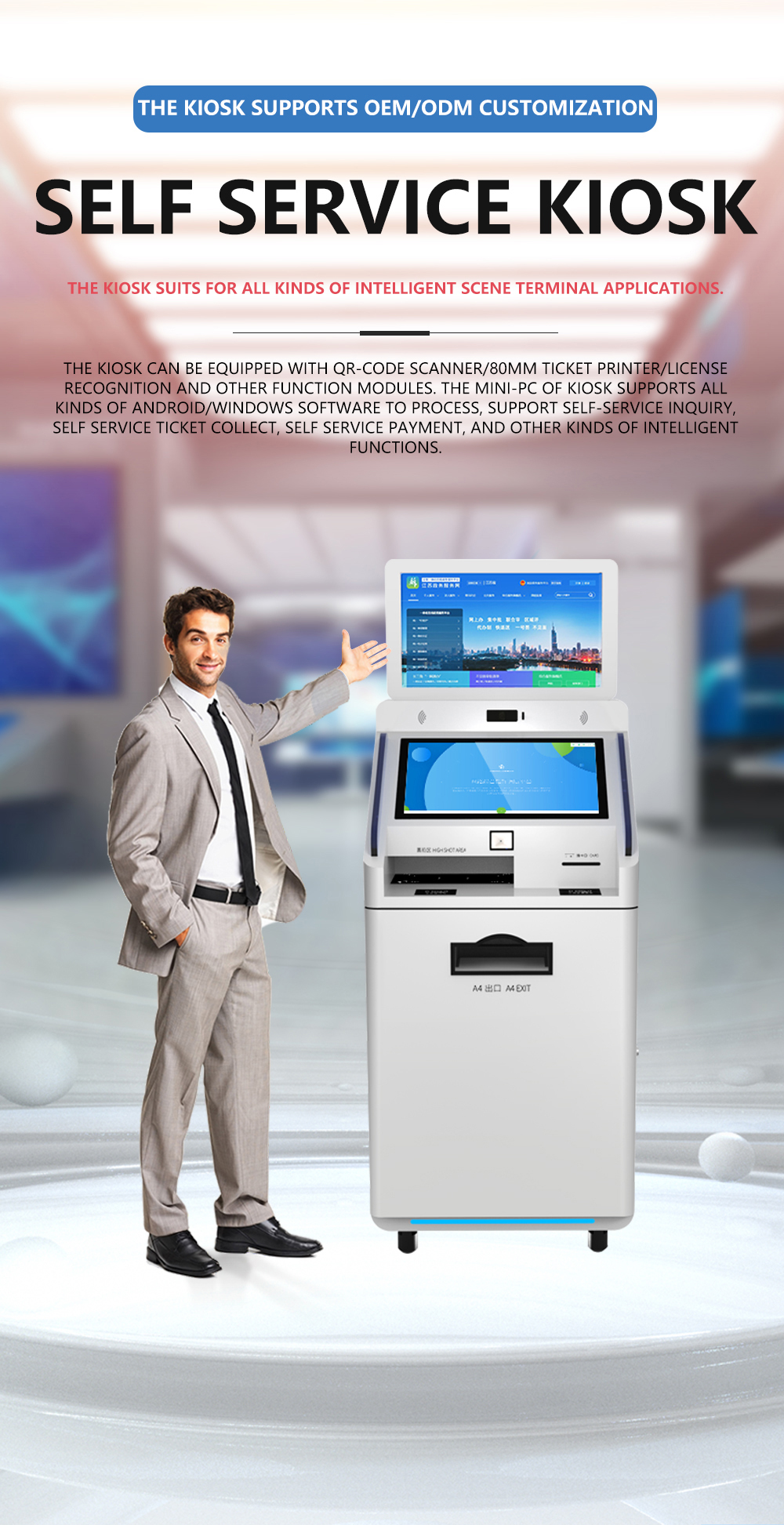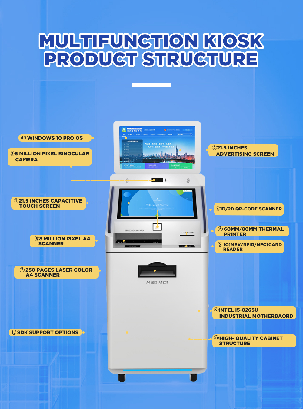 The Multifunctional Self-Service Kiosk is an intelligent terminal device that integrates multiple service functions, leveraging advanced AI, IoT, and multimodal interaction technologies to deliver a “one-stop” self-service experience. It combines core capabilities such as printing, copying, scanning, payment processing, information querying, and business transaction handling, catering to diverse scenarios including government services, finance, healthcare, retail, and education. Designed to streamline workflows, reduce labor costs, enhance user satisfaction, and accelerate digital transformation, this device empowers organizations to upgrade their service delivery with smart, efficient solutions.