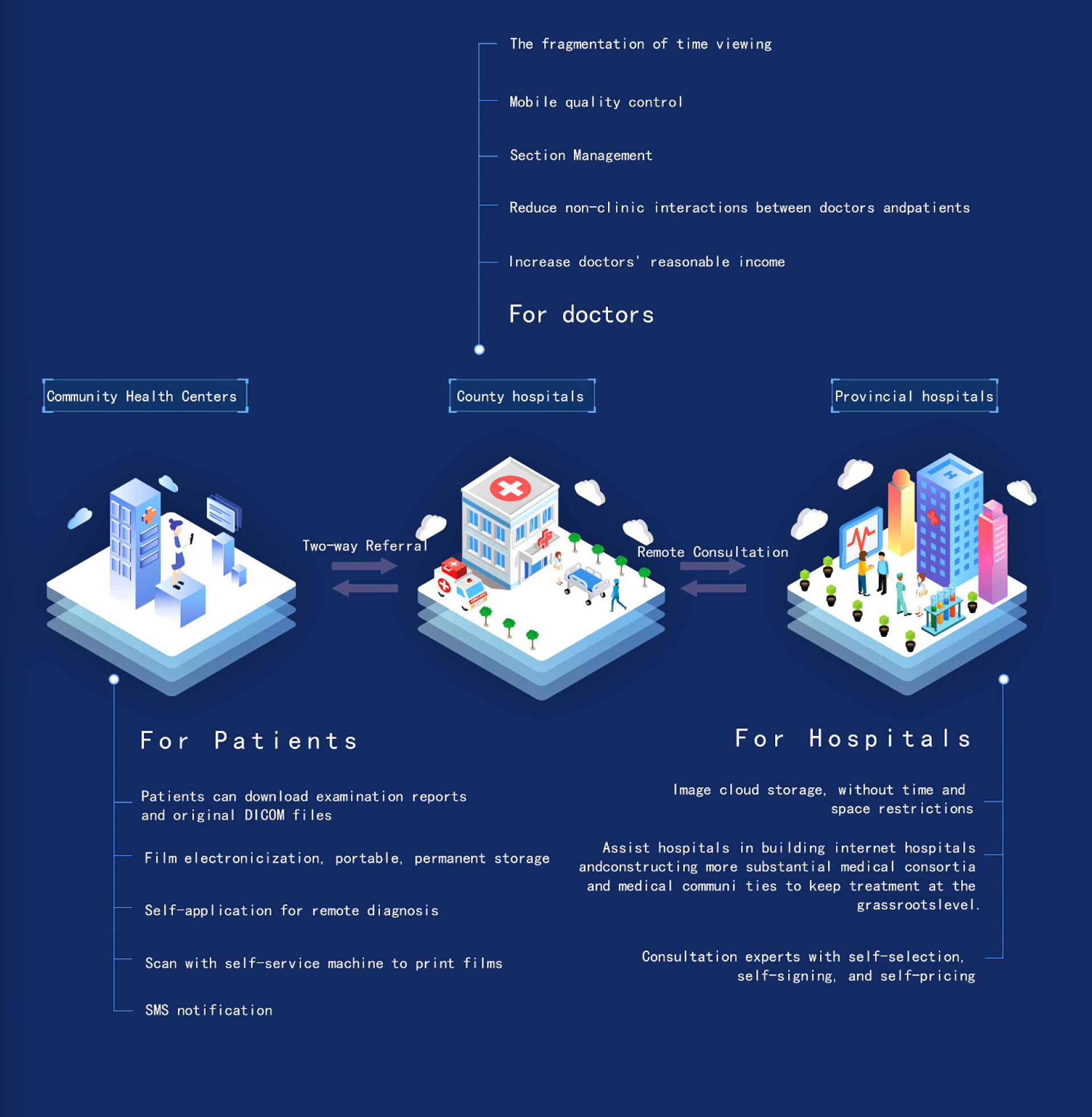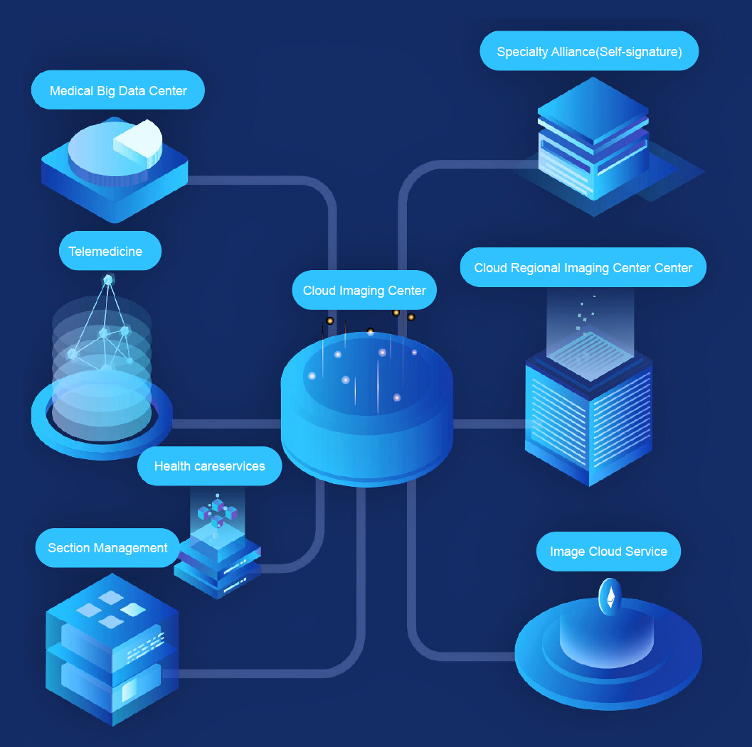The cloud imaging center utilizes digital communication and information processing technology, Internet technology, and digital medical imaging technology to achieve long-distance non-destructive transmission of digital medical image. It enables imaging physicians to quickly and conveniently browse digital imagery from remote locations to conduct medical imaging diagnostic activities for patients in real time, meeting the different needs of different medical institutions. In response to the national policy of the classification of the medical care industry, remote imaging has been used to sink the highest quality medical resources to the grassroots. Depending on the patient’s condition, through the province, city, The four-tier consultation platform at the county, community/township level has been created for patients to make appointments for outpatient visits to higher hospitals, examine them, and stay in hospital, actively guided patients to first visits to the community, two-way referrals, rapid and slow separation, and up-and-down coordination, perfectly achieving both reduction and improvement.